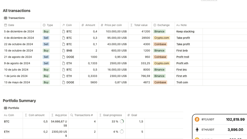 Take control of your crypto investments with this clean, powerful, and easy-to-use Notion template designed for investors and traders who want a simple solution to monitor their transactions, portfolio performance, and goals.